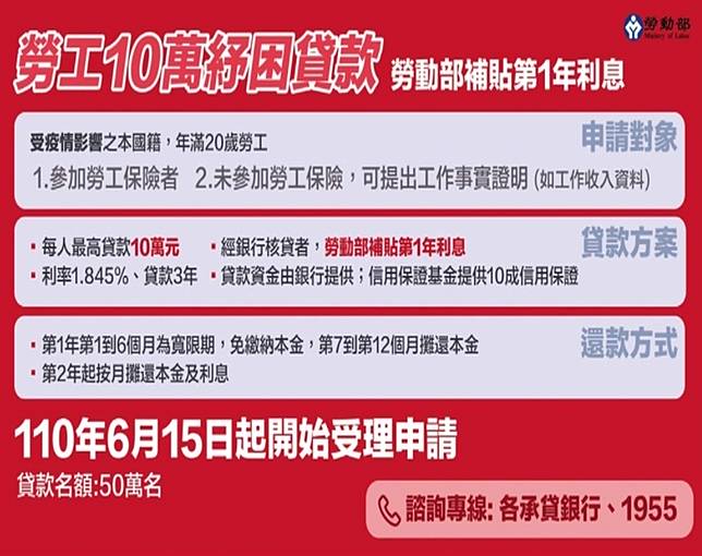 Jun 10, 2021 · 勞動部公告,勞工可貸款10萬元紓困金,15日開始受理申請。 (記者塗建榮攝) 〔記者李雅雯/台北報導〕勞工紓困貸款十萬元方案將在六月十五日(下週二)開辦,釋出五十萬個名額;行政院跨部會小組拍板新增申貸條件,二 一九年度個人各類所得總額在五十萬元以下才可申貸。